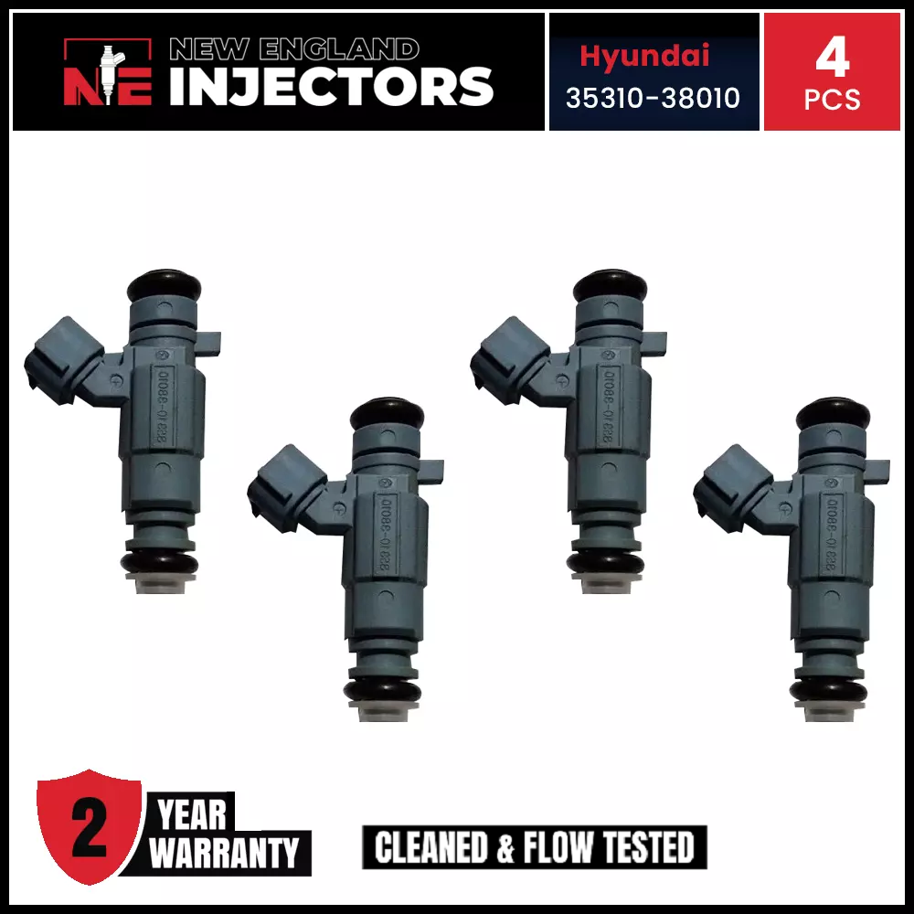 Remanufactured Hyundai 35310-38010 fuel Injector set of 4 for 1999-2006 Hyundai Sonata, Santa Fe; Kia Optima. Professionally rebuilt to OEM specs using only genuine OEM injectors. Includes fast shipping and a 2-year warranty.