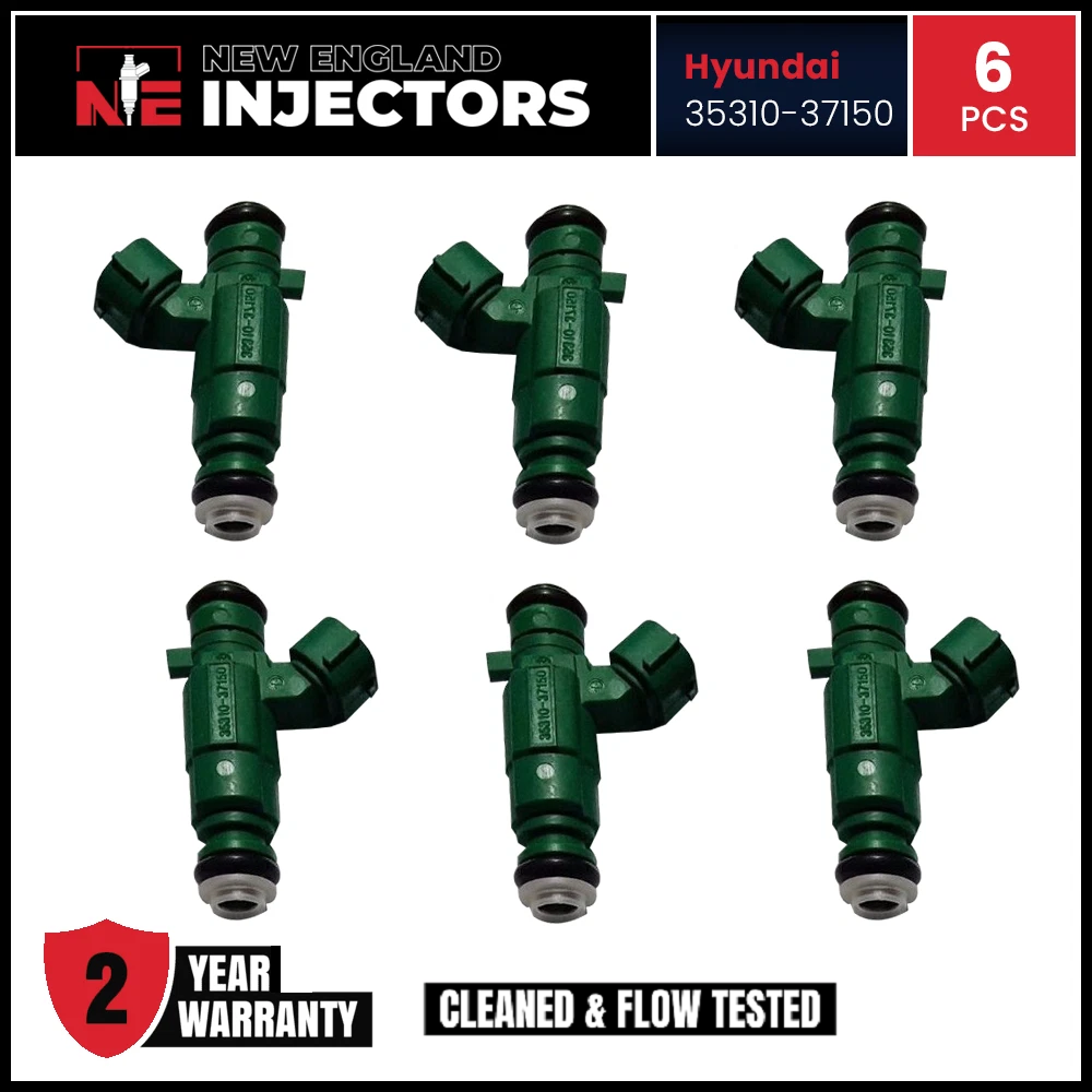 Remanufactured Hyundai 35310-37150 Fuel Injectors set (6) for 2002-2004 Kia Hyundai Sportage Tucson Tiburon Santa Fe Optima Sonata Magentis. Professionally rebuilt to OEM specs using only genuine OEM injectors. Includes fast shipping and a 2-year warranty.