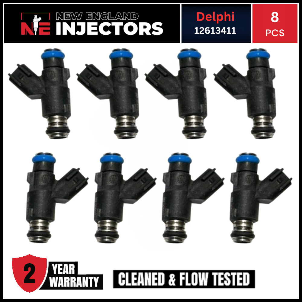 Remanufactured Delphi 12613411 Fuel Injectors set (8) for 2010–2017 Chevrolet Express 1500, Express 2500, Express 3500, Suburban 1500, Tahoe, Avalanche, Silverado 1500, Colorado, GMC Savana 1500, Savana 2500, Sierra, Sierra 1500, Canyon, Cadillac Escalade, Hummer H3 H3T. Professionally rebuilt to OEM specs using only genuine OEM injectors. Includes fast shipping and a 2-year warranty.