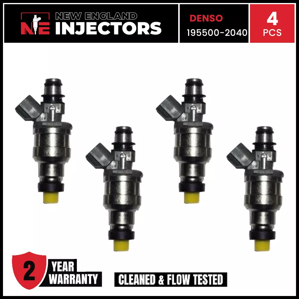 Remanufactured Denso 195500-2040 fuel Injector set of 4 for 1990-1995 Kia Sephia; Mazda 323, Protege, MX; Daihatsu Rocky. Professionally rebuilt to OEM specs using only genuine OEM injectors. Includes fast shipping and a 2-year warranty.