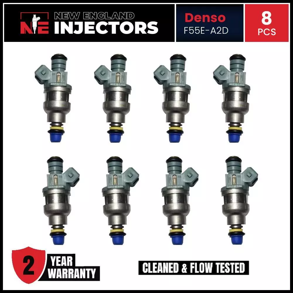 Remanufactured Denso F55E-A2D Fuel Injectors set (8) for 1995-1998 Lincoln Ford Mustang Continental Mark VIII. Professionally rebuilt to OEM specs using only genuine OEM injectors. Includes fast shipping and a 2-year warranty.