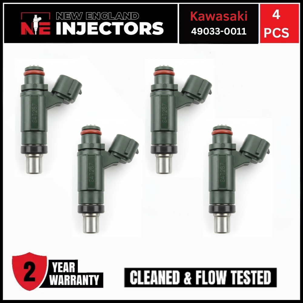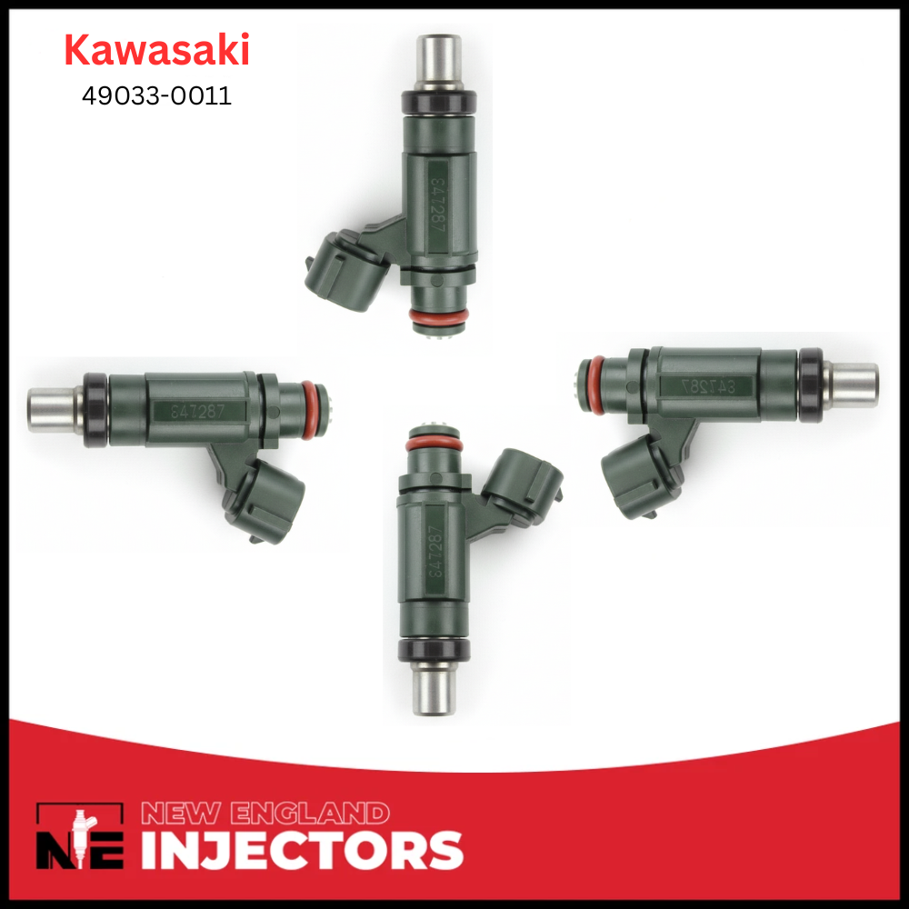 Remanufactured Kawasaki 49033-0011 Fuel Injectors set (4) for 2006–2024 Brute Force 750, Concours 14, ER-6N, KX65, Ninja 650, Ninja 650R, Ninja ZX10R, Ninja ZX14, Teryx4 750, Teryx4 800, Teryx 800, Versys 650, Vulcan 900, Vulcan S, Vulcan S 650. Professionally rebuilt to OEM specs using only genuine OEM injectors. Includes fast shipping and a 2-year warranty.