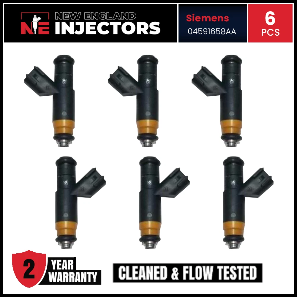 Remanufactured Siemens 04591658AA Set of 6 Fuel Injectors for 2000-2004 Chrysler 300M, Concorde, LHS; Dodge Intrepid; Plymouth Prowler. Professionally rebuilt to OEM specs using only genuine OEM injectors. Includes fast shipping and a 2-year warranty.