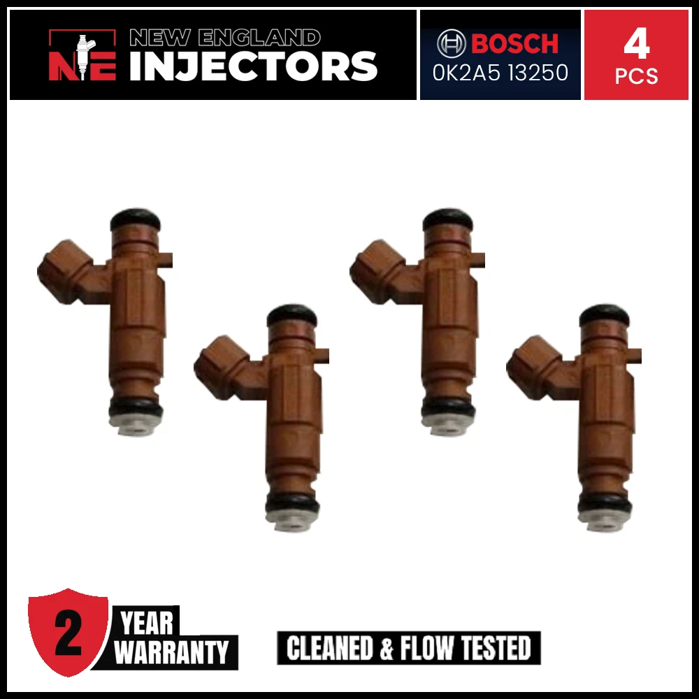 Remanufactured Bosch 0K2A5-13250 fuel Injector set of 4 for 1998-2004 Kia Sephia, Spectra. Professionally rebuilt to OEM specs using only genuine OEM injectors. Includes fast shipping and a 2-year warranty.
