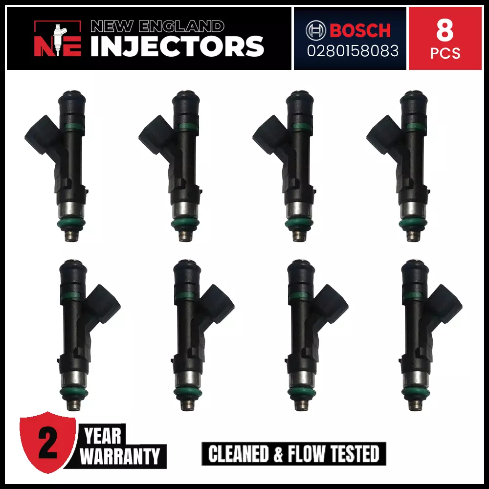 Remanufactured Bosch 0280158083 fuel Injector set of 8 for 2004-2014 Cadillac Escalade, DTS, STS, SRX, XLR; Buick Lucerne. Professionally rebuilt to OEM specs using only genuine OEM injectors. Includes fast shipping and a 2-year warranty.