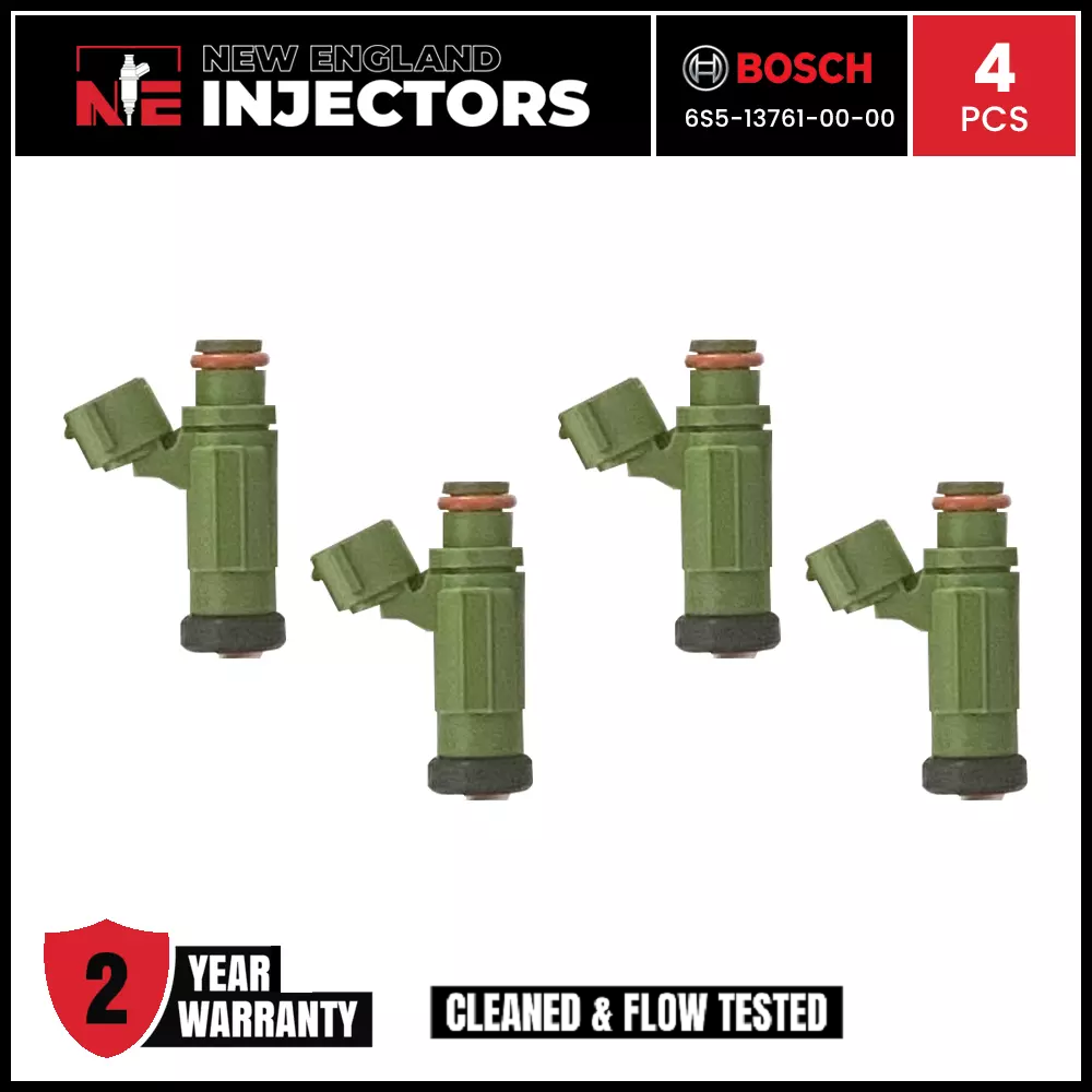 Remanufactured Bosch 6S5-13761-00-00 Set of 4 fuel Injectors for Yamaha FX VXR, VXS, FZR, FZS, FXHO, SHO, SX. Professionally rebuilt to OEM specs using only genuine OEM injectors. Includes fast shipping and a 2-year warranty.