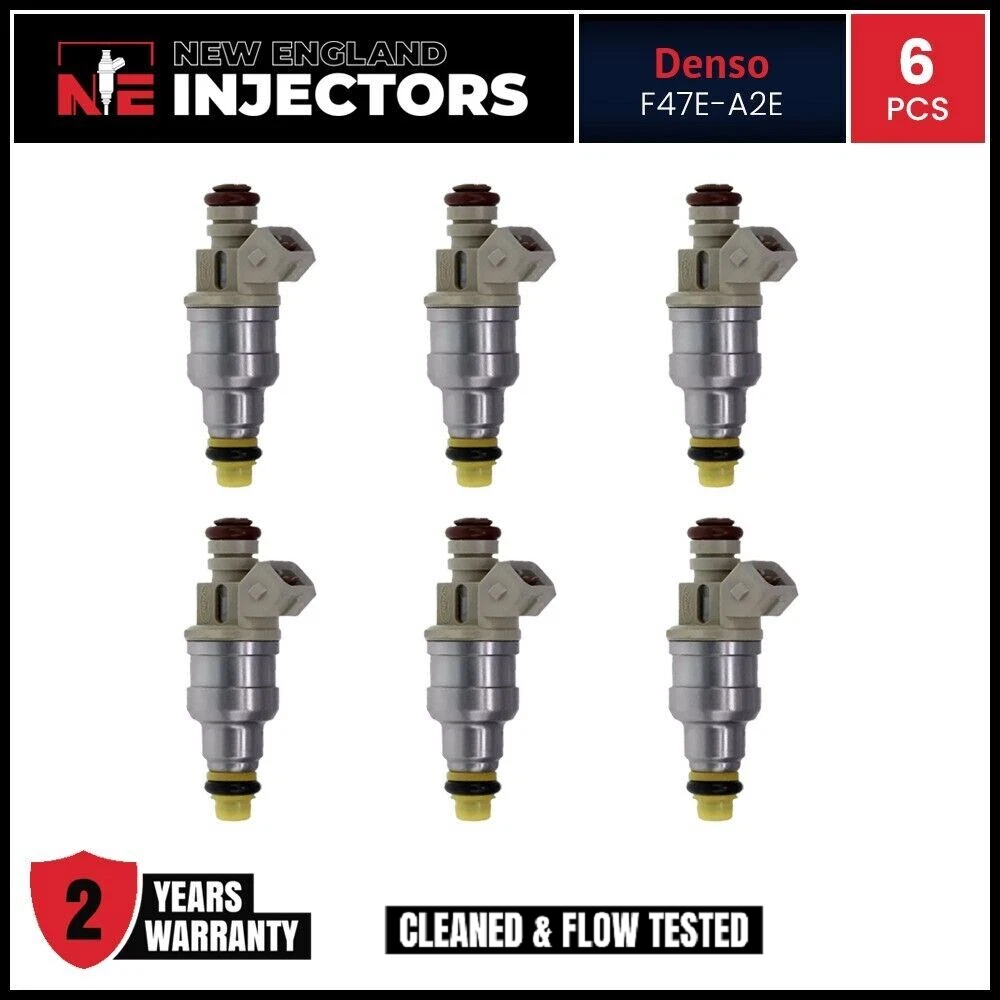 Remanufactured Denso F47E-A2E fuel Injector set of 6 for 1985-1993 Ford • Mercury • Lincoln, Continental Cougar • Mustang • Country Squire • LTD • Ranger • Taurus • Colony Park • Grand Marquis • Sable • Bronco II • Tempo • Town Car • Topaz • Mark VII • LTD • Aerostar • Thunderbird • Crown Victoria. Professionally rebuilt to OEM specs using only genuine OEM injectors. Includes fast shipping and a 2-year warranty.