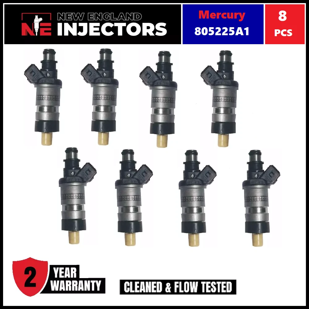 Remanufactured Mercruiser 805225A1 Set of 8 fuel Injectors for Mercruiser Marine 454 V8. Professionally rebuilt to OEM specs using only genuine OEM injectors. Includes fast shipping and a 2-year warranty.