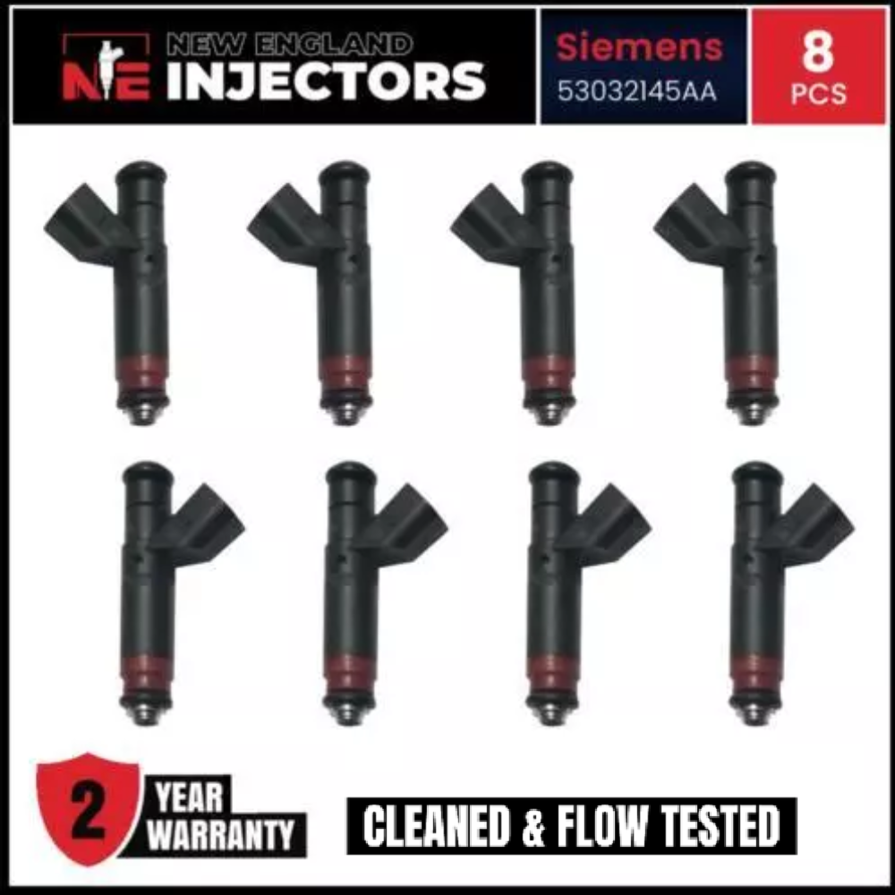 Remanufactured Siemens 53032145AA Fuel Injectors set (8) for 1993-2007 Chrysler Aspen; Dodge Dakota, Durango, Ram 1500; Jeep Grand Cherokee; Mitsubishi Raider; Ford Mustang, E-150 Econoline, E-150 Econoline Club Wagon, E-250 Econoline, E-350 Econoline, E-350 Econoline Club Wagon, F-150.Professionally rebuilt to OEM specs using only genuine OEM injectors. Includes fast shipping and a 2-year warranty.