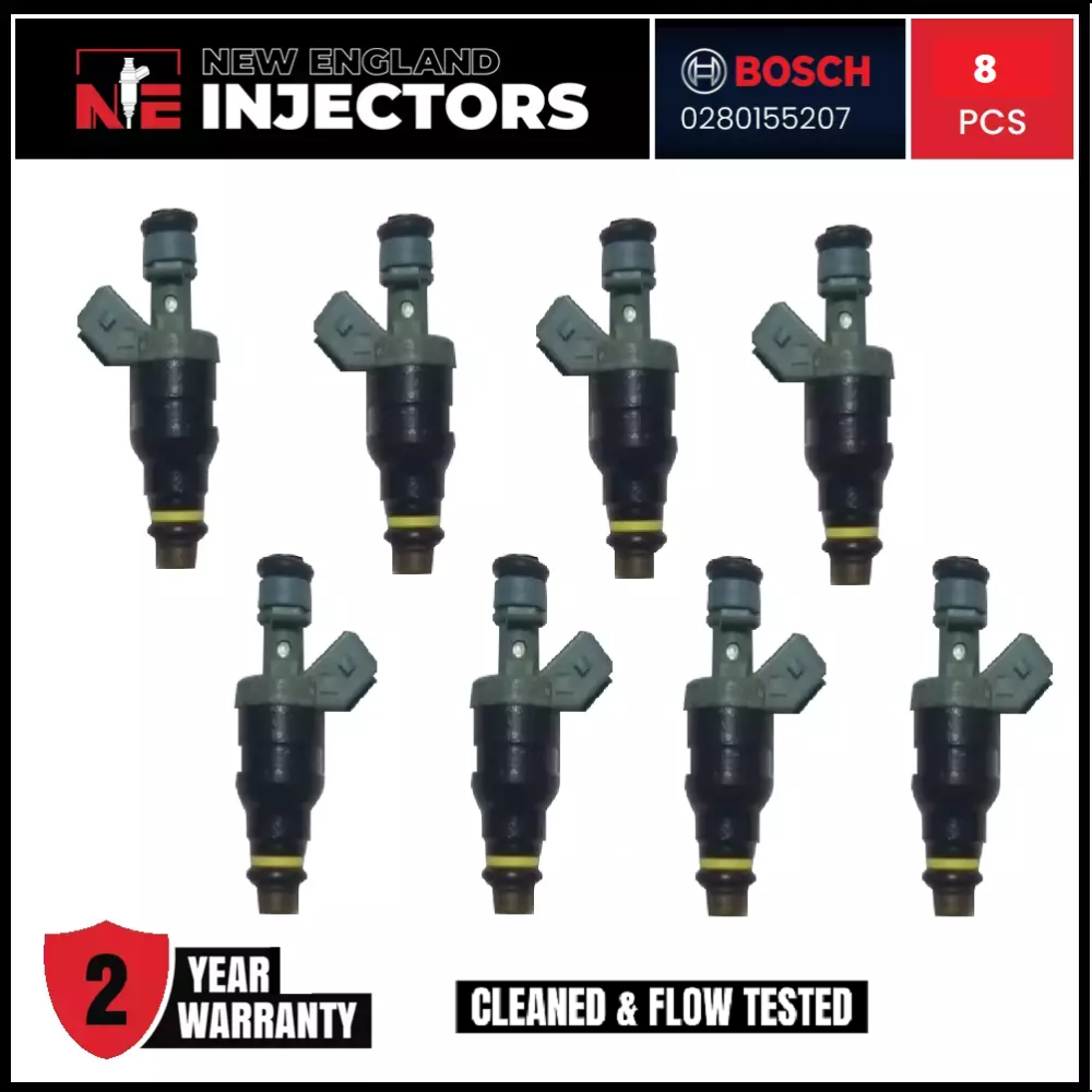 Remanufactured Bosch 0280155207 Fuel Injectors set (8) for 1992–1997 Mercedes-Benz E420 S420 S500 SL500 E500 400E 400SEL 500SEC 500SL 400SE 500E 500SE Professionally rebuilt to OEM specs using only genuine OEM injectors. Includes fast shipping and a 2-year warranty.